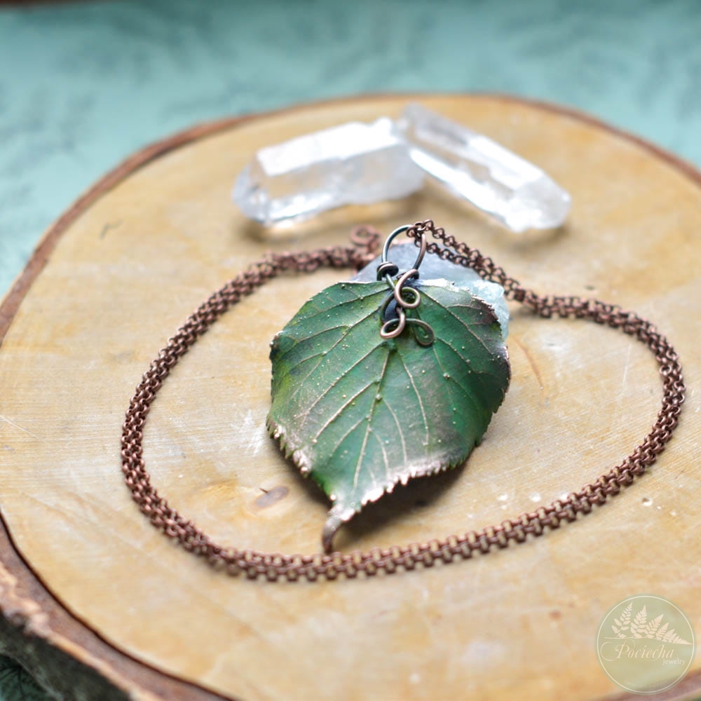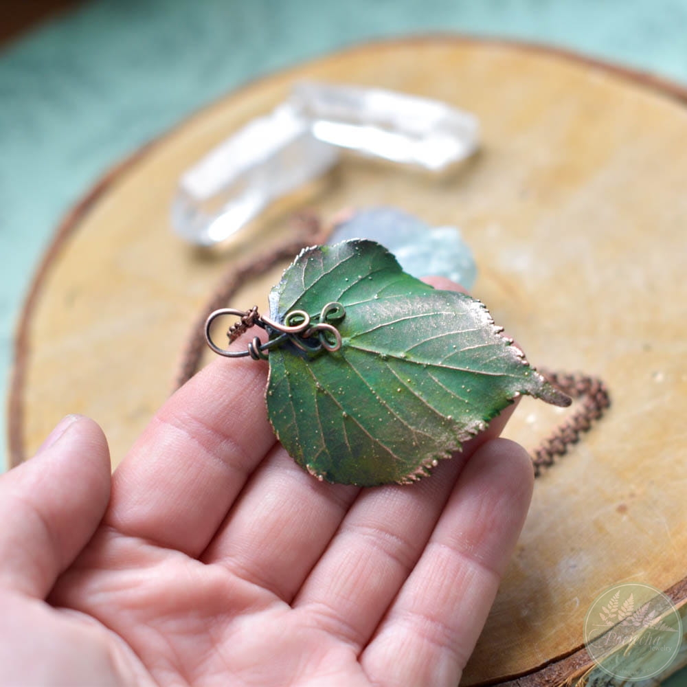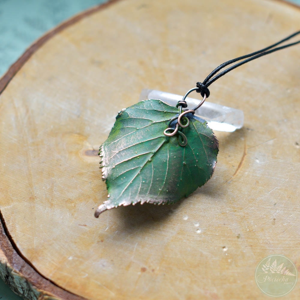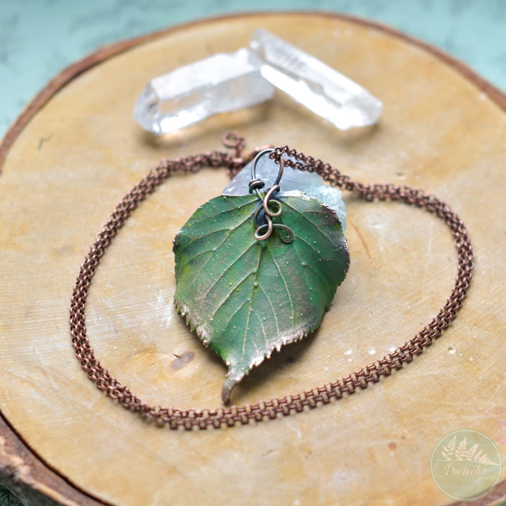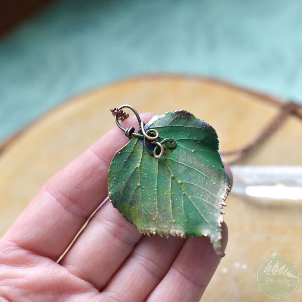 Poznaj wyjątkowy wisiorek — prawdziwym liściem lipy pokrytym miedzią, idealny dla miłośników natury i oryginalnej biżuterii.