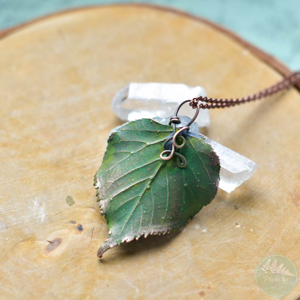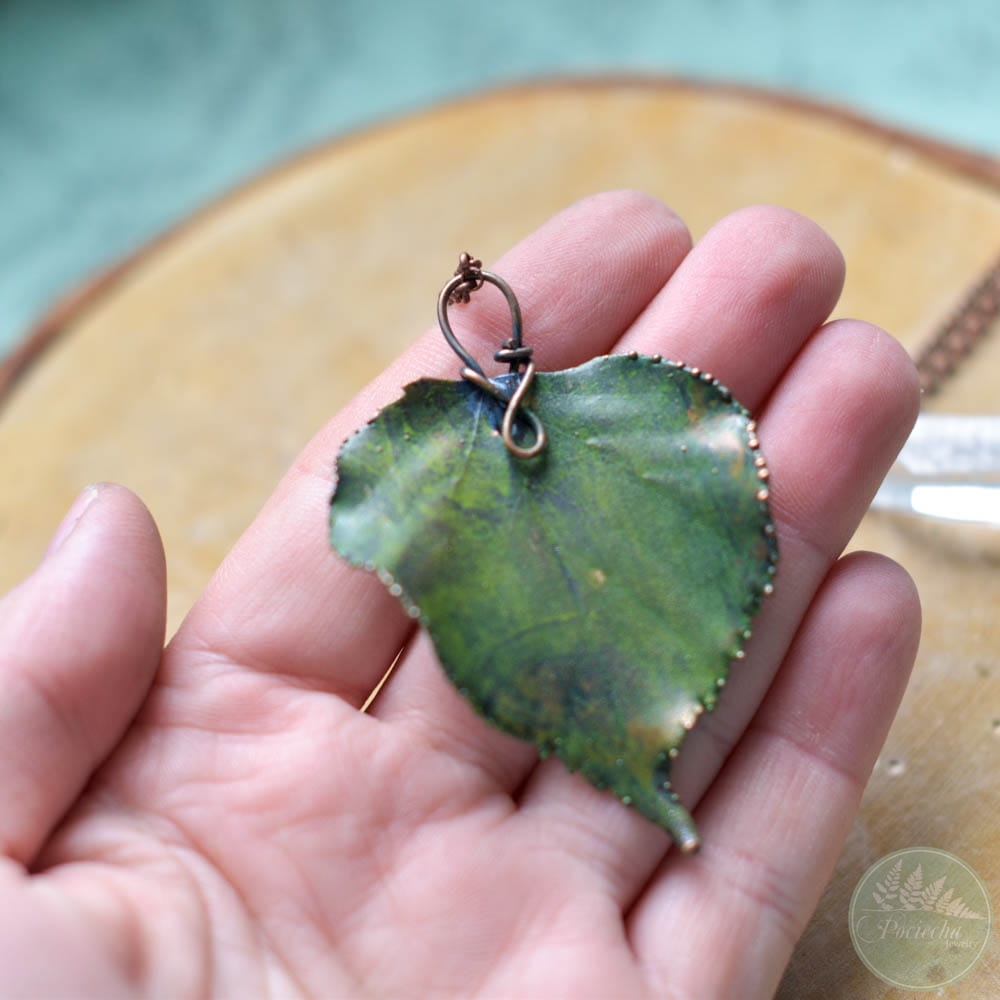 Ciepły połysk miedzi i zielony kolor, który nadałam na końcu podkreślają strukturę liścia i nadają mu eleganckiego wykończenia.